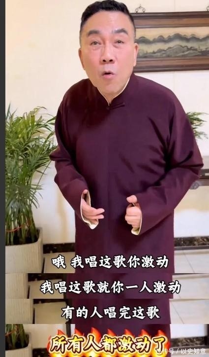 他身着传统大褂,模仿姜昆手持手风琴的姿态,身旁助理配合道:“一听这歌我就热血沸腾!”